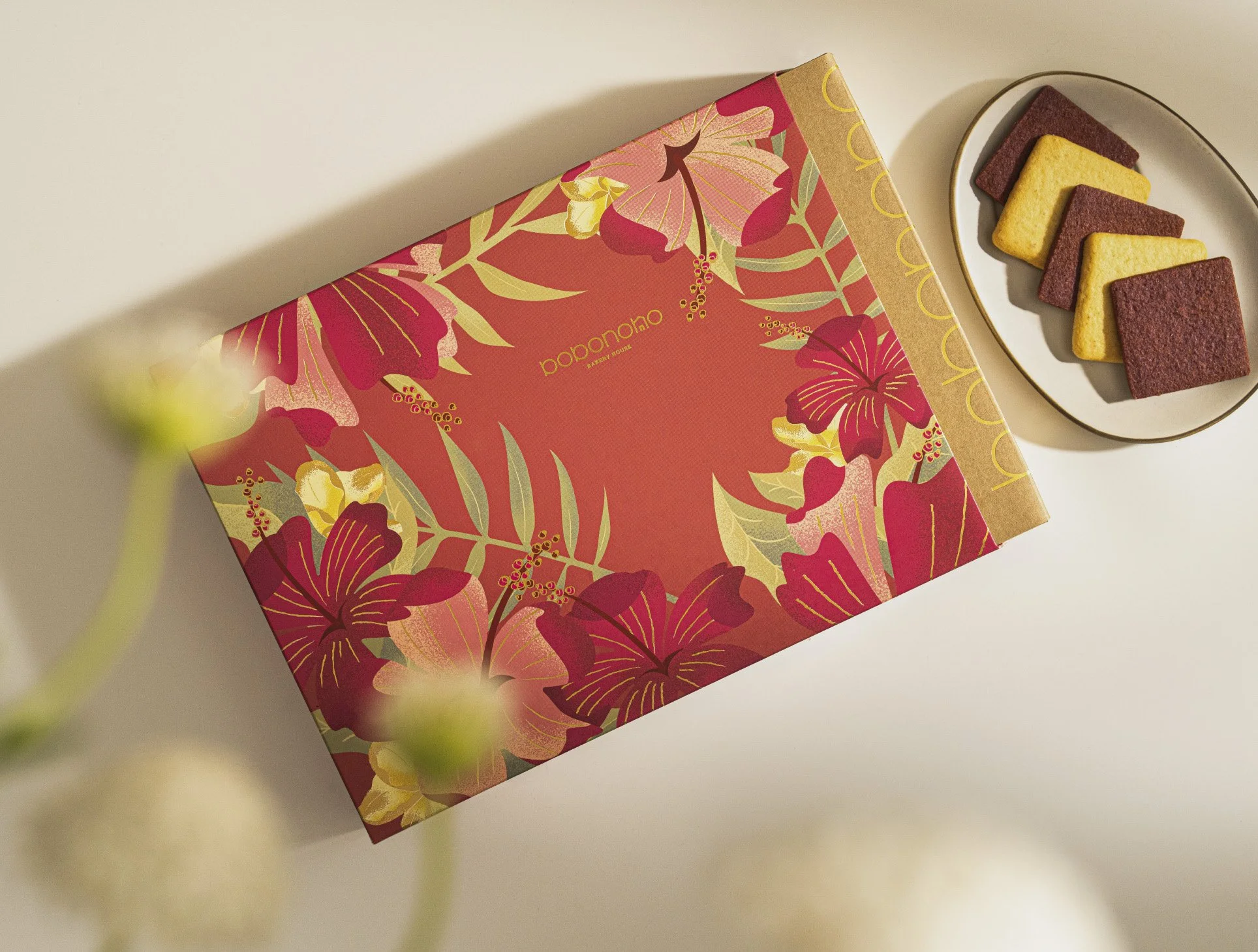 波波諾諾2024年全新推出繁花喜餅禮盒,以四大色系及花卉作為分類 釉紅瑪瑙 / 緋紅石瑠 / 湛藍琉璃 / 羽紫丁香 四色分成四種盒型,延用原花卉插圖溫潤風格,並做印刷及結構上的升級規劃,噴砂式燙金點綴,同時採用側拉盒型設計增添儀式感。
