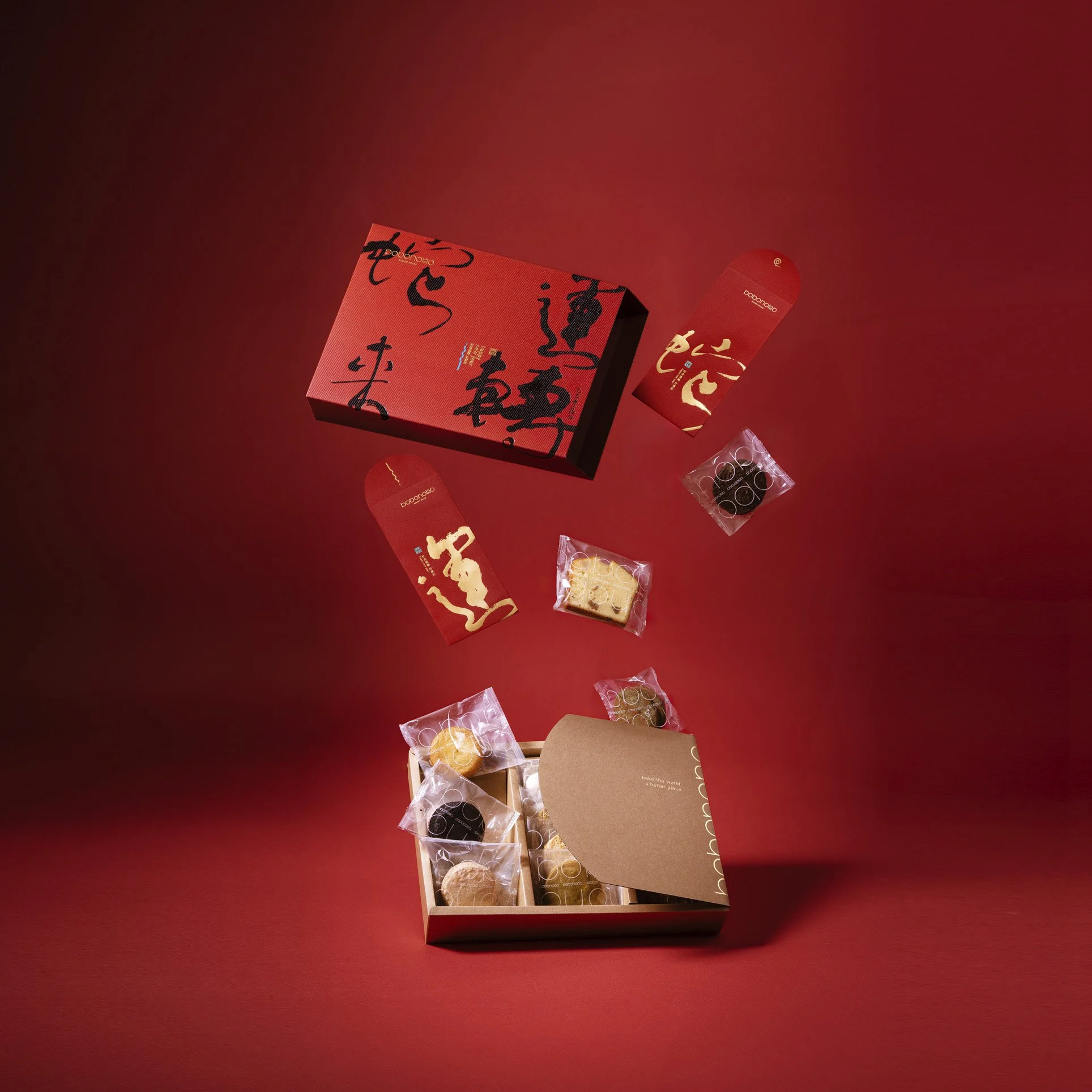 中盒設計以行草書法「財蛇到」揮毫呈現,增添趣味與獨特風格。青藍蛇形象徵好運席捲,活力與吉祥兼具。書本式扉頁營造儀式感,轉角燙金低調奢華。內含多款創新甜點,風味獨特,一試難忘。