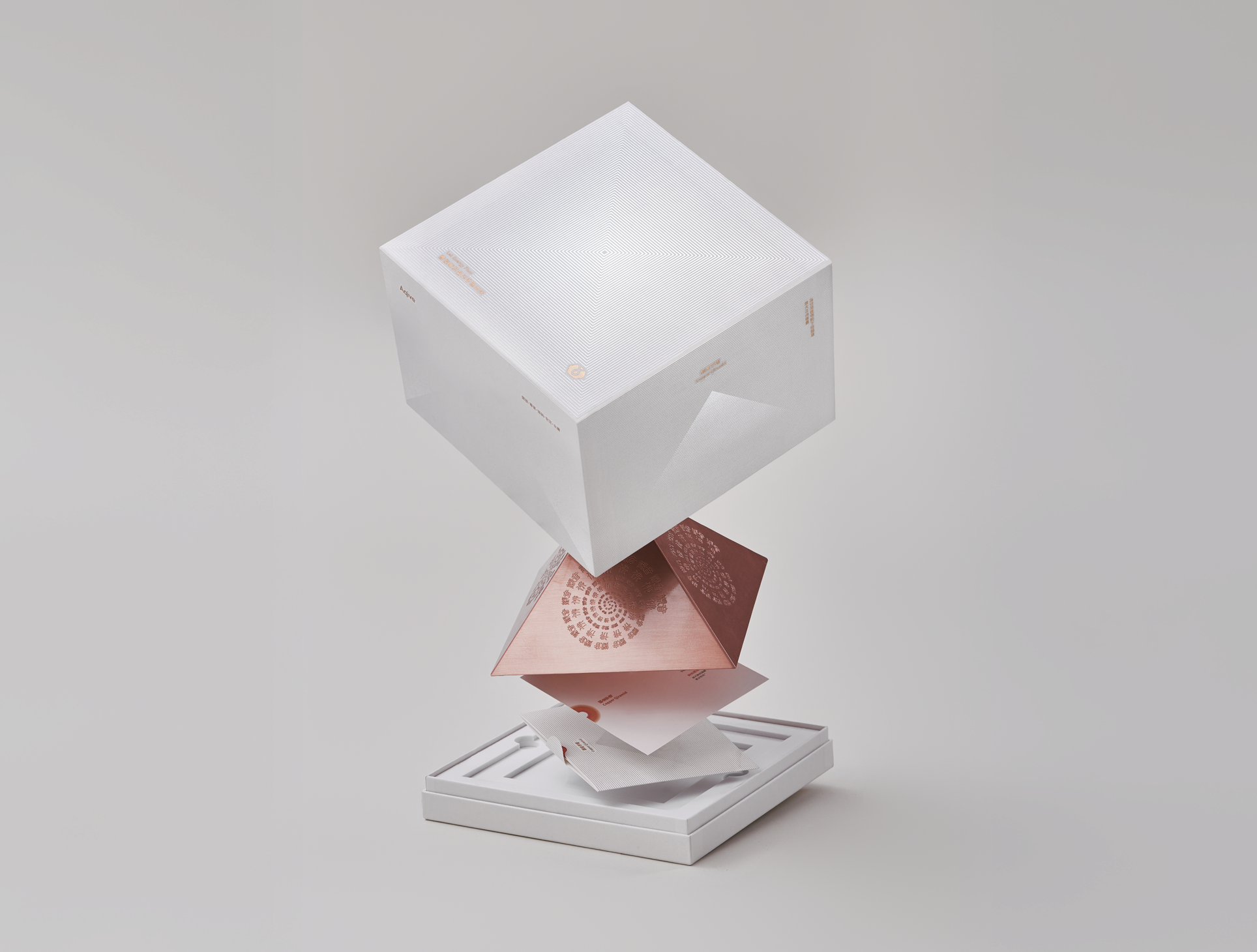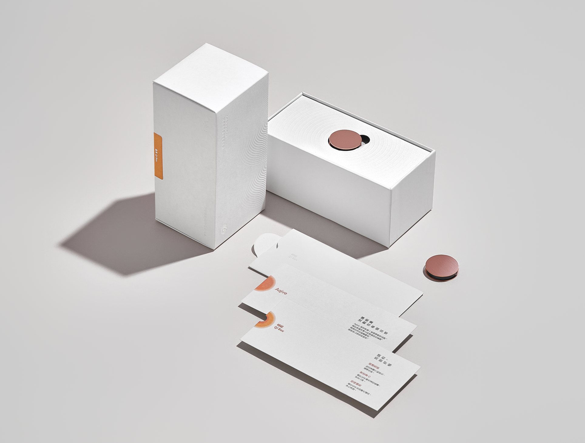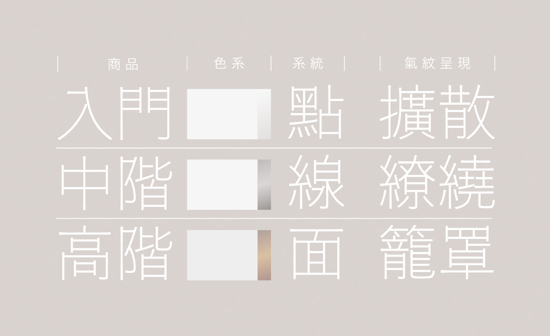 三種層級對應不同氣場影響範圍與使用深度,氣紋以不同流動方式形塑格局,並以珠白、霧銀、銅金燙印點綴,清楚呈現產品等級、氣場強度與價值層次,讓使用者在第一眼即理解氣與商品之間的距離與進階路徑。