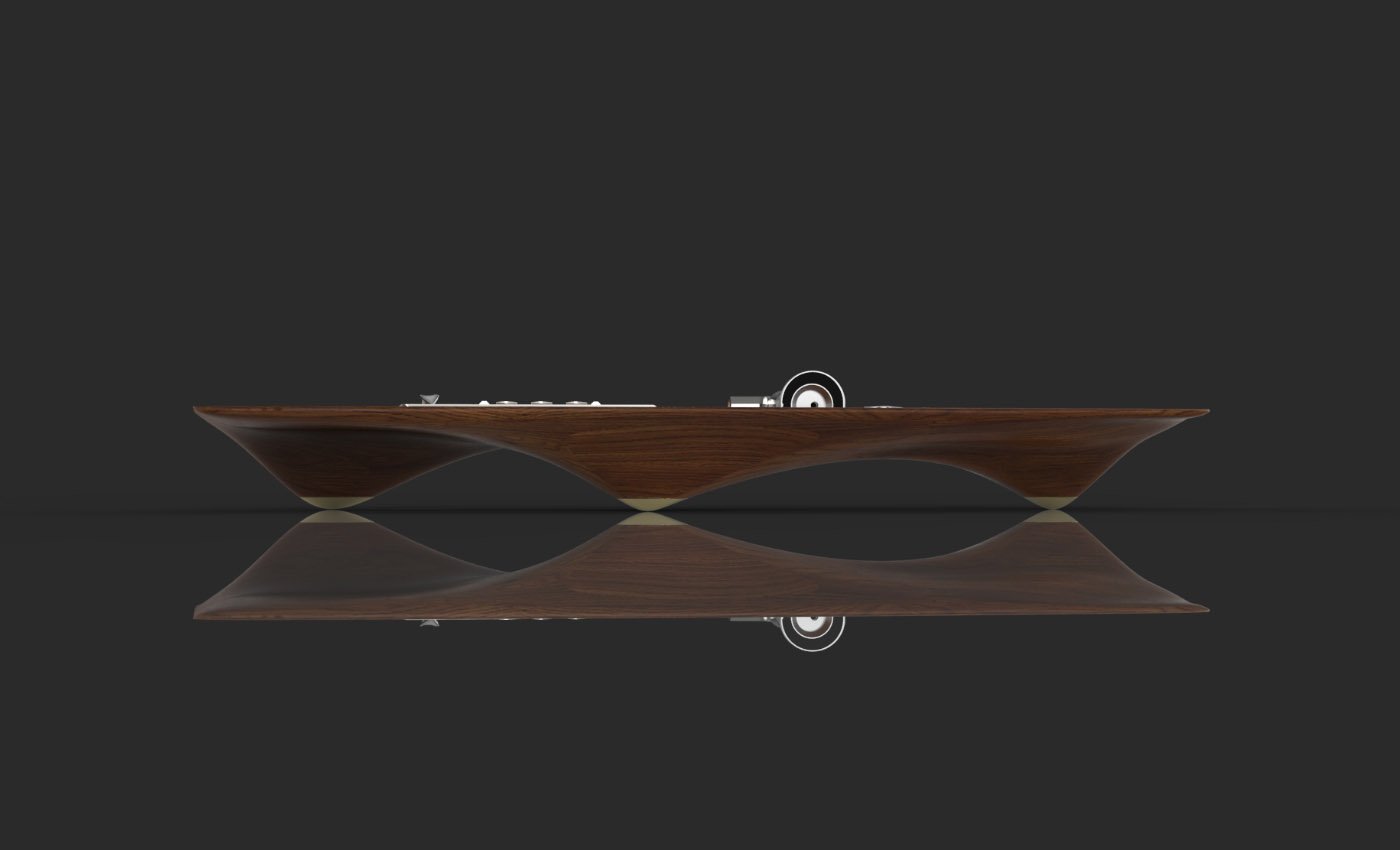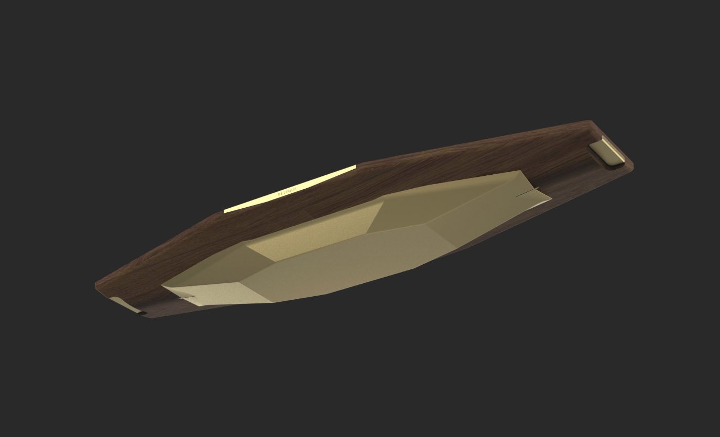 微懸浮式站立,深色胡桃木併用黃銅塊深坎於側邊下方,手把細節切面藏於下方。