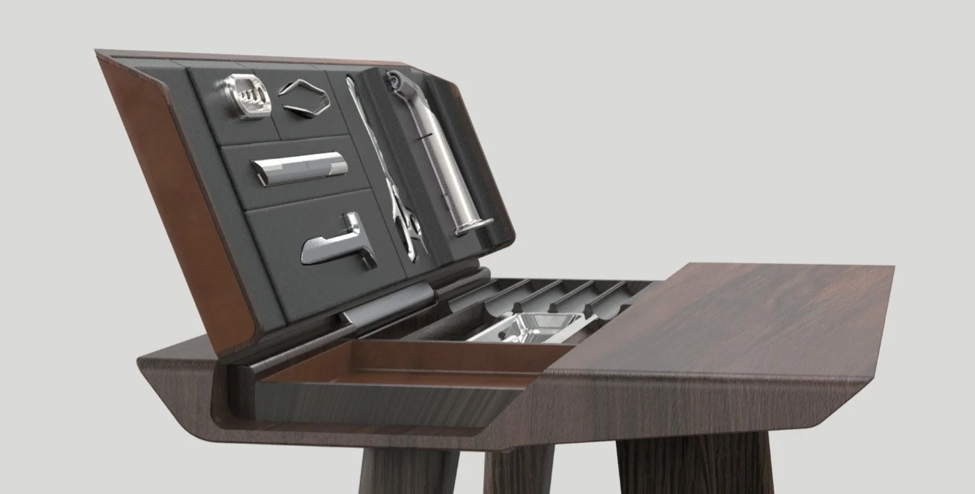 以純金屬式製作工法,上襯可支撐高壓力之藍寶石玻璃,讓器具可更完美的被保護在工作檯上,側拉式機械滑輪設計,抽拉同時可看見類似陀飛輪般的連動式機械細節,內面板上運用灰黑皮車縫高密度泡綿革做坎入商品,讓商品被溫潤的置放於內。