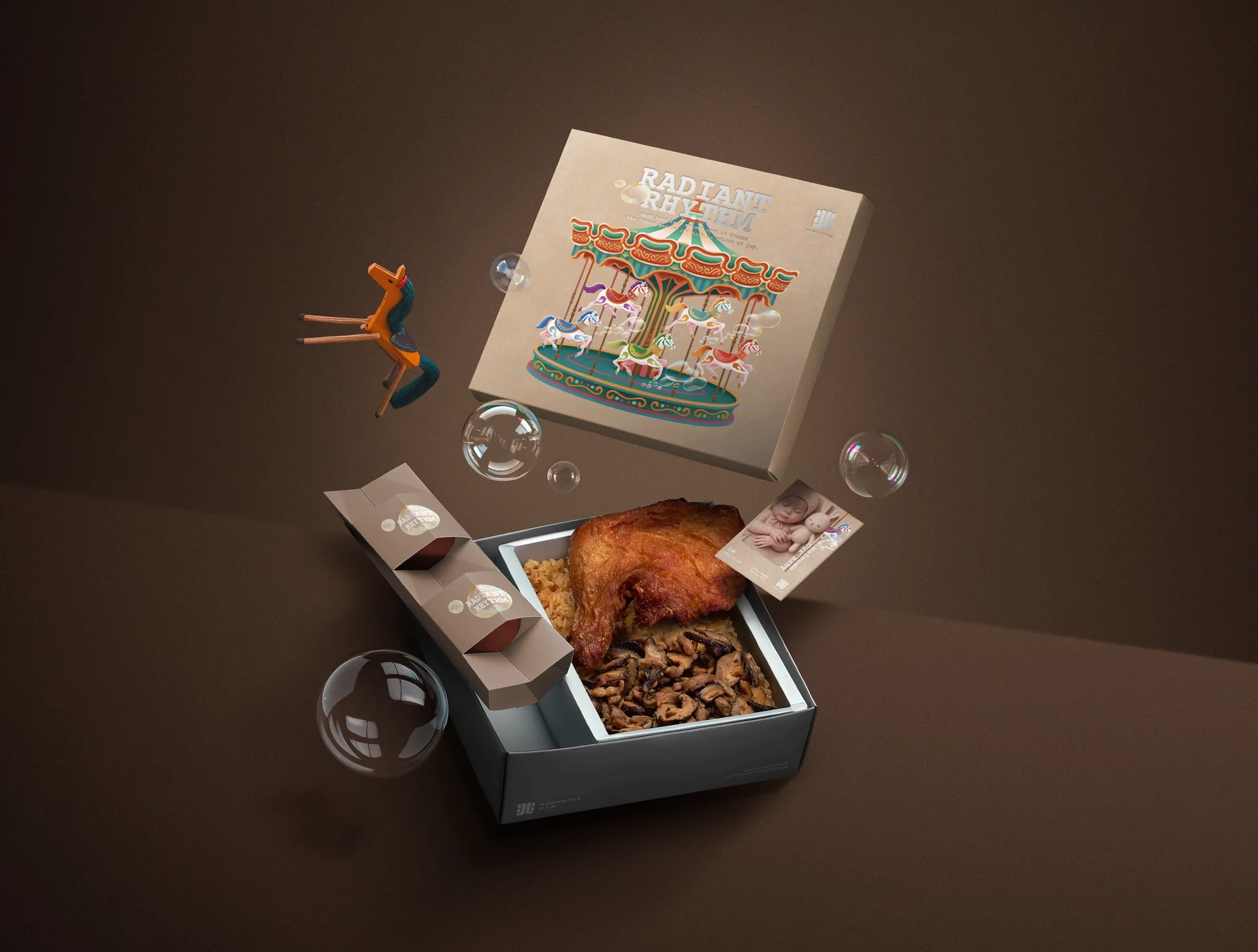 首款包裝以旋轉木馬為主題,RADIANT RHYTHM 為繽紛的律動為標題,寓意期許每次旋轉,都是夢境的旋律,未來,描繪幸福的童話。花瓣層層綻放,如同家庭的幸福與對誕生的華麗感謝。設計以霧面紙卡手繪質感的白色大理花搭配黃銅燙金字樣,並以普魯士藍斑駁紋路為底,交織出細膩層次,呈現低奢而優雅的英式氣息。