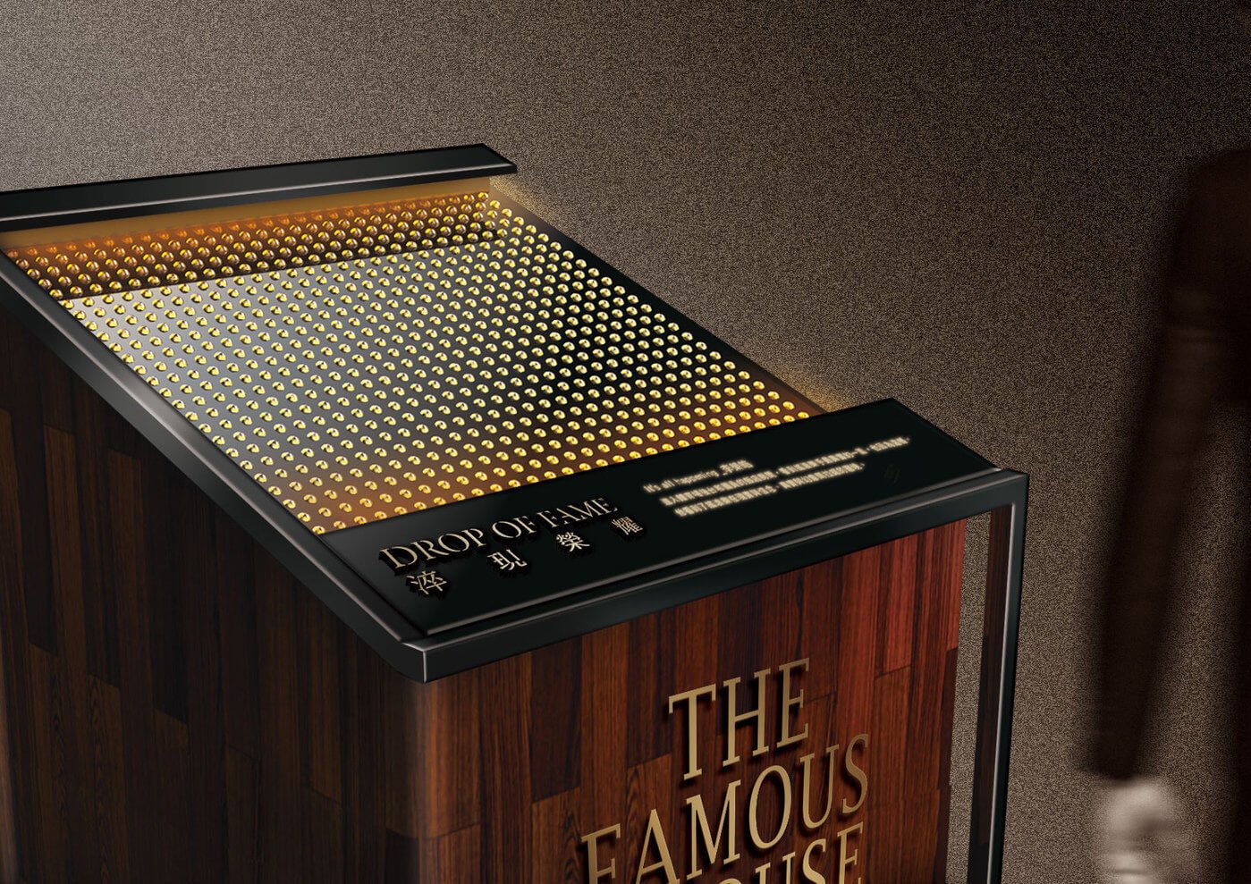 運用超奈米防潑水布底部裝置三千多根針筒,並使用機械式結構與電腦控制,奈米防水布將水滴上推出四種不同大小如浮空錯覺的圓型水滴,建構成網點般的圖像,加上金色的光源打下,讓水滴如酒液般浮出。