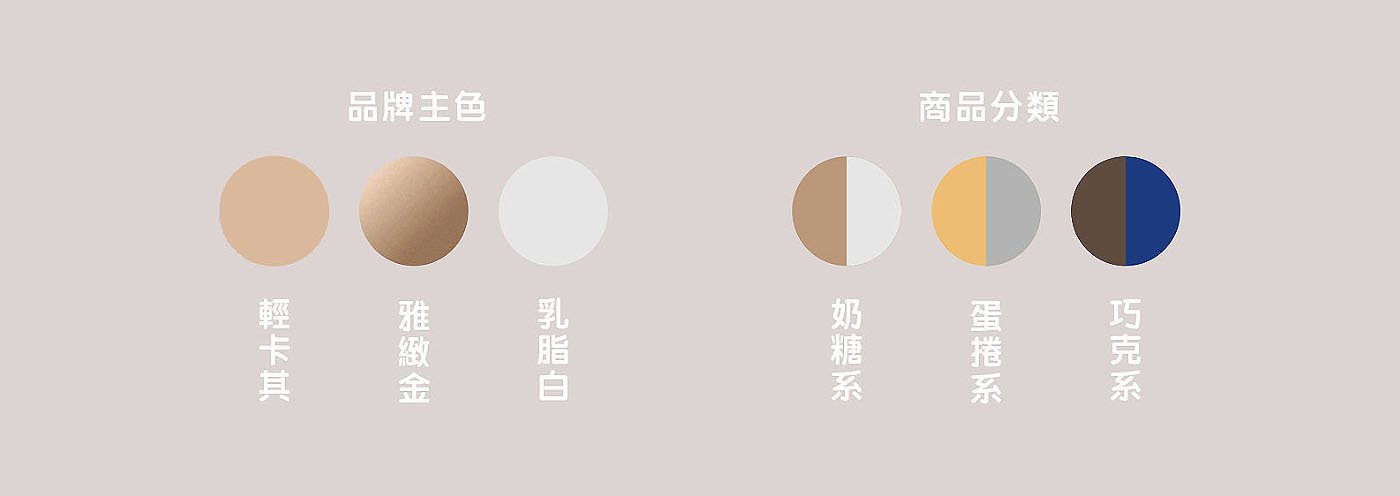 商標以「恬」的字型結構設計,細膩甜潤帶融合感的印鑑風格,體現恬烏托對於食物的最高要求。輕卡其作為品牌主色即為粉潤;雅緻金與乳脂白作為點綴與純淨的輔助色,而商品分類,皆以可與口味直接聯想的色系作為雙色搭配。