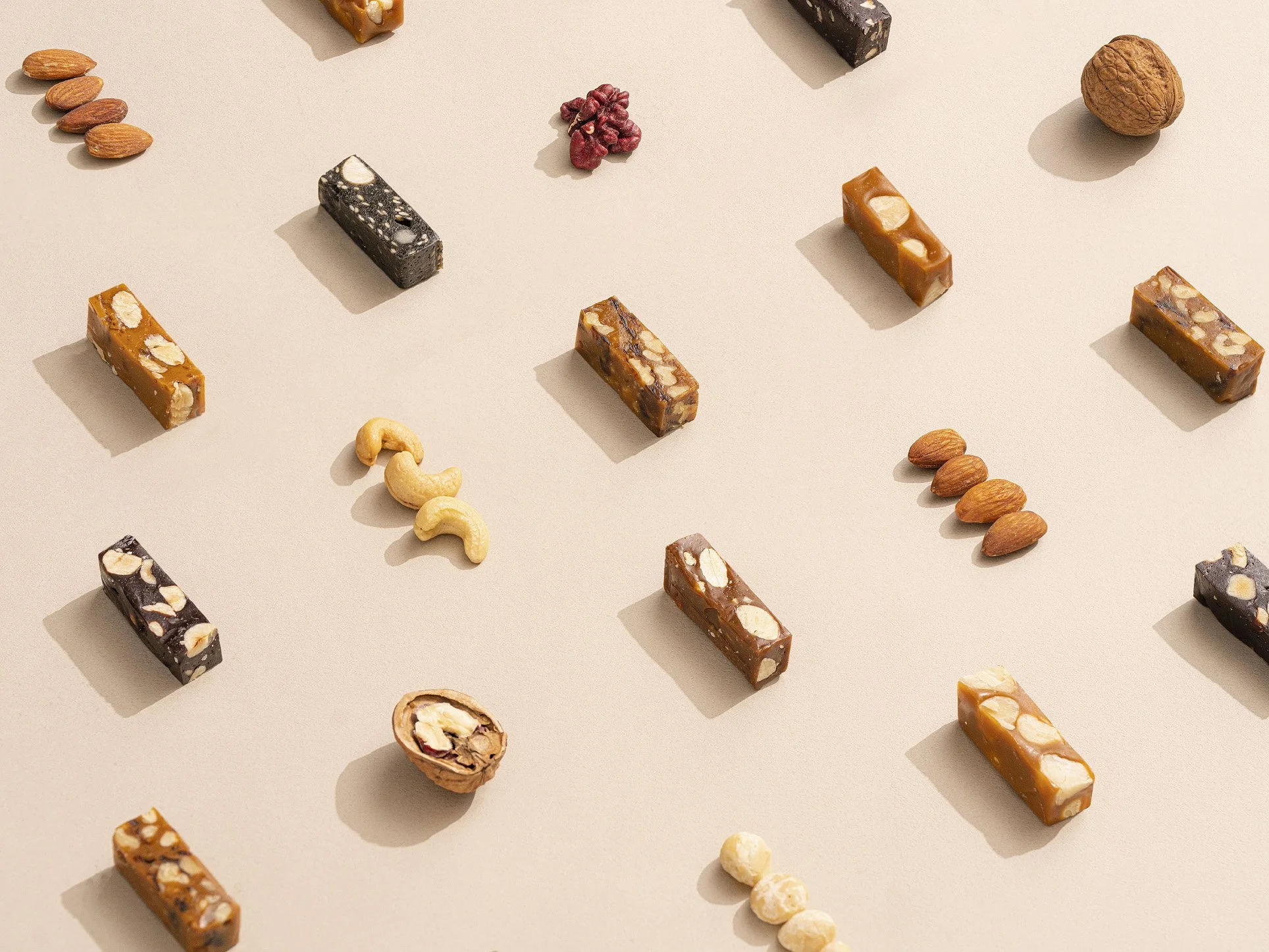 牛奶糖色系焦糖與白色為主色,古拙手繪描繪乳牛環抱堅果,展現恬烏托樸質的食材世界。右下角印鑑式商標彰顯對食品安全的誠信保證。絲絨紙印刷,右拉式開盒增添儀式感,內盒上下圖騰扉頁以燙金圓貼封閉,開啟後呈現牛奶糖為主角,清新呈現品牌商標,深化印象。